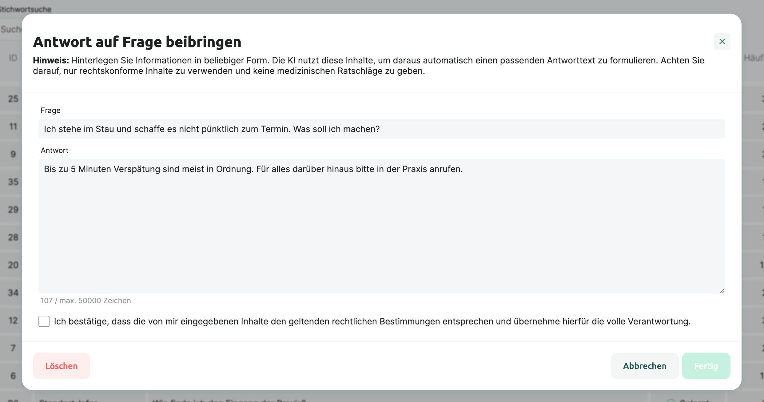 Wenn Sie eine neue eigene Frage anlegen möchten, klicken Sie oben auf den grünen Button „Fragen hinzufügen“. Dort hinterlegen Sie einfach die gewünschte Frage und die passende Antwort, bestätigen Ihre Eingabe und klicken auf „Fertig“. Die Frage ist damit direkt angelegt und für Ihre VoiceAI trainiert.